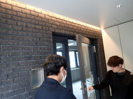 | 4月1日(火) 番外編 | 屋上などの防水工事が進んでいます。 曲率の大きい部分はレンガの幅を半分にしています。 4階、5階の内装工事も進んでいます。 天井の断熱材。 エアコンのパイプ類も天井裏なので先に入れてあります。 内廊下の壁もきれいに塗装されました。 電気、弱電の立て配線 4階の玄関方向。階段を上ってくるとこういう風に見えます。 反対側 3階の玄関前の壁には外壁から続くレンガが貼られました。 このレンガ貼りでは、アールの部分、インターフォン、玄関ドア枠のところで 半端が出ないように計算して寸法を合わせたそうです。 局面ガラスも入りました。 テナント階の天井部分には火災報知器が付きます。(消防法) 3階の正面窓は両側が開きます。 2階の正面窓ははめ殺しですが、横縞のアクセントが付きます。 内装工事 お風呂場 居室からの換気扇パイプは火災で温度が上がると自動的に閉止になります。 防火ダンパーという部品だそうです。(消防法、延焼防止) 5階への内階段。 屋上から青山通り報告 |